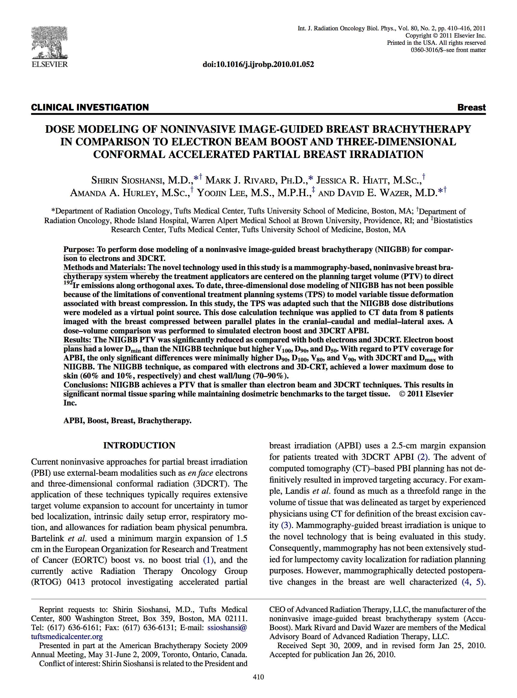 The novel technology used in this study is a mammography-based, noninvasive breast brachytherapy system whereby the treatment applicators are centered on the planning target volume (PTV) to direct 192Ir emissions along orthogonal axes. To date, three-dimensional dose modeling of NIIGBB has not been possible because of the limitations of conventional treatment planning systems (TPS) to model variable tissue deformation associated with breast compression. In this study, the TPS was adapted such that the NIIGBB dose distributions were modeled as a virtual point source. This dose calculation technique was applied to CT data from 8 patients imaged with the breast compressed between parallel plates in the cranial-caudal and medial-lateral axes. A dose–volume comparison was performed to simulated electron boost and 3DCRT APBI.